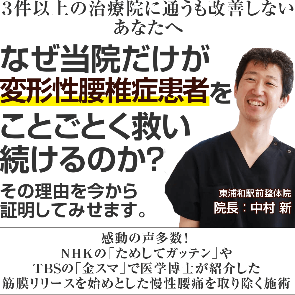 初めまして。変形性腰椎症専門整体の東浦和駅前整体院の中村です。