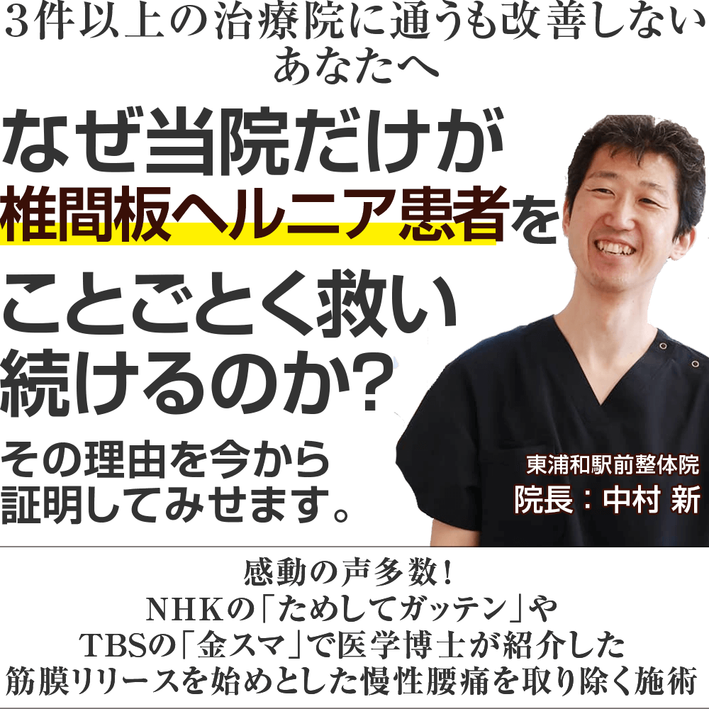 初めまして。椎間板ヘルニア専門整体の東浦和駅前整体院の中村です。